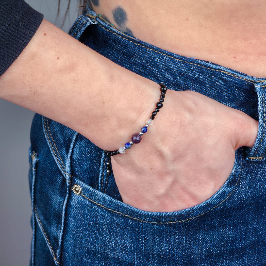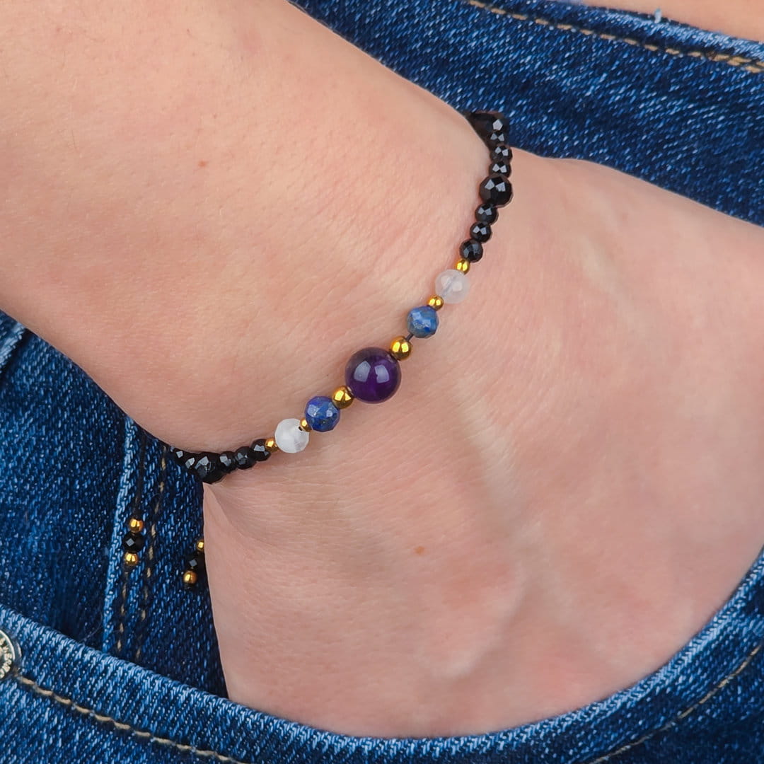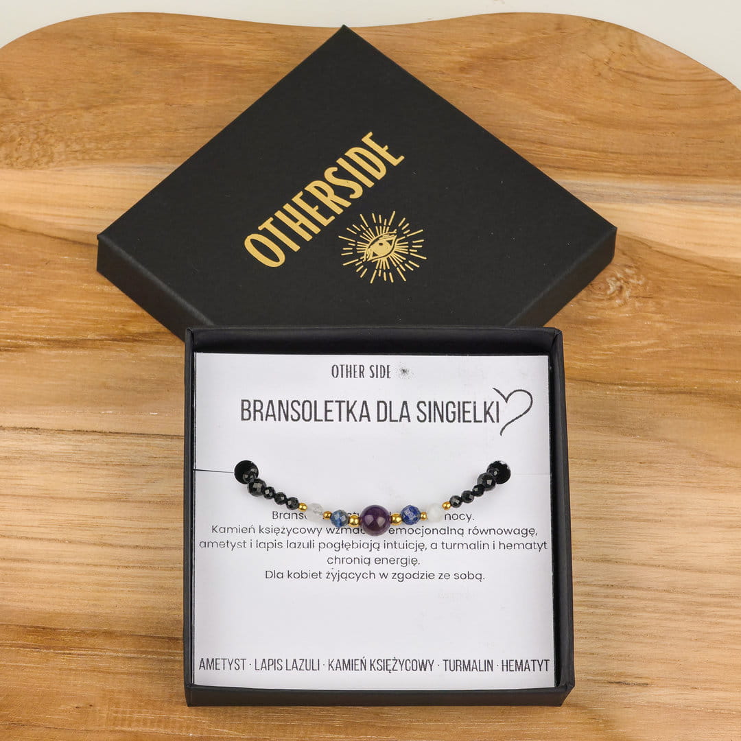 Ta bransoletka dla singielki z ametystu, lapis lazuli, kamienia księżycowego, turmalinu i hematytu została stworzona z myślą o kobietach, które chcą pogłębić kontakt z intuicją, zadbać o wewnętrzny spokój i jednocześnie ochronić swoją energię. To harmonijne połączenie kamieni wspierających świadomość, emocjonalną równowagę i stabilność.