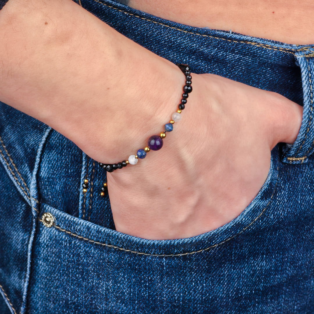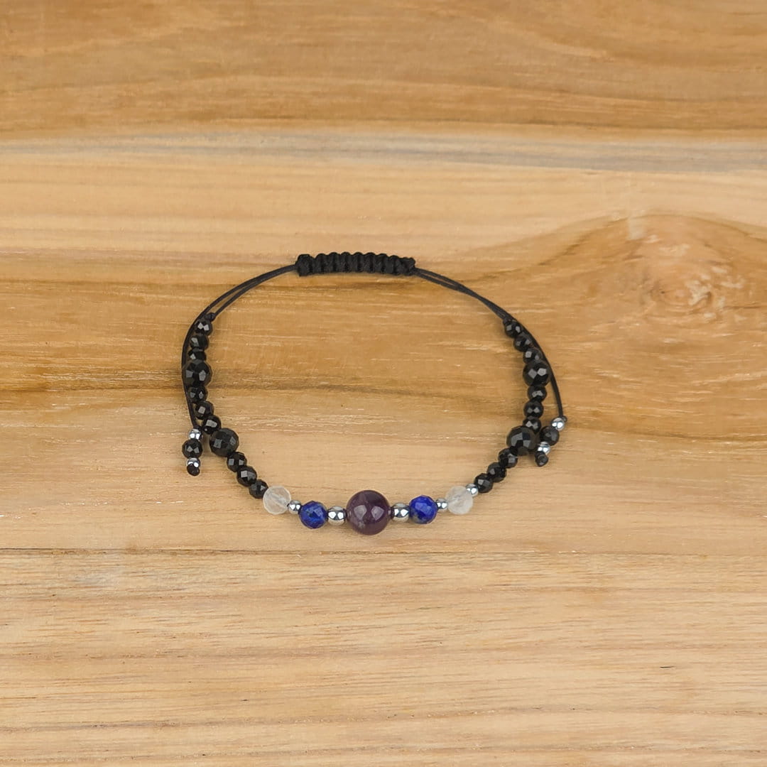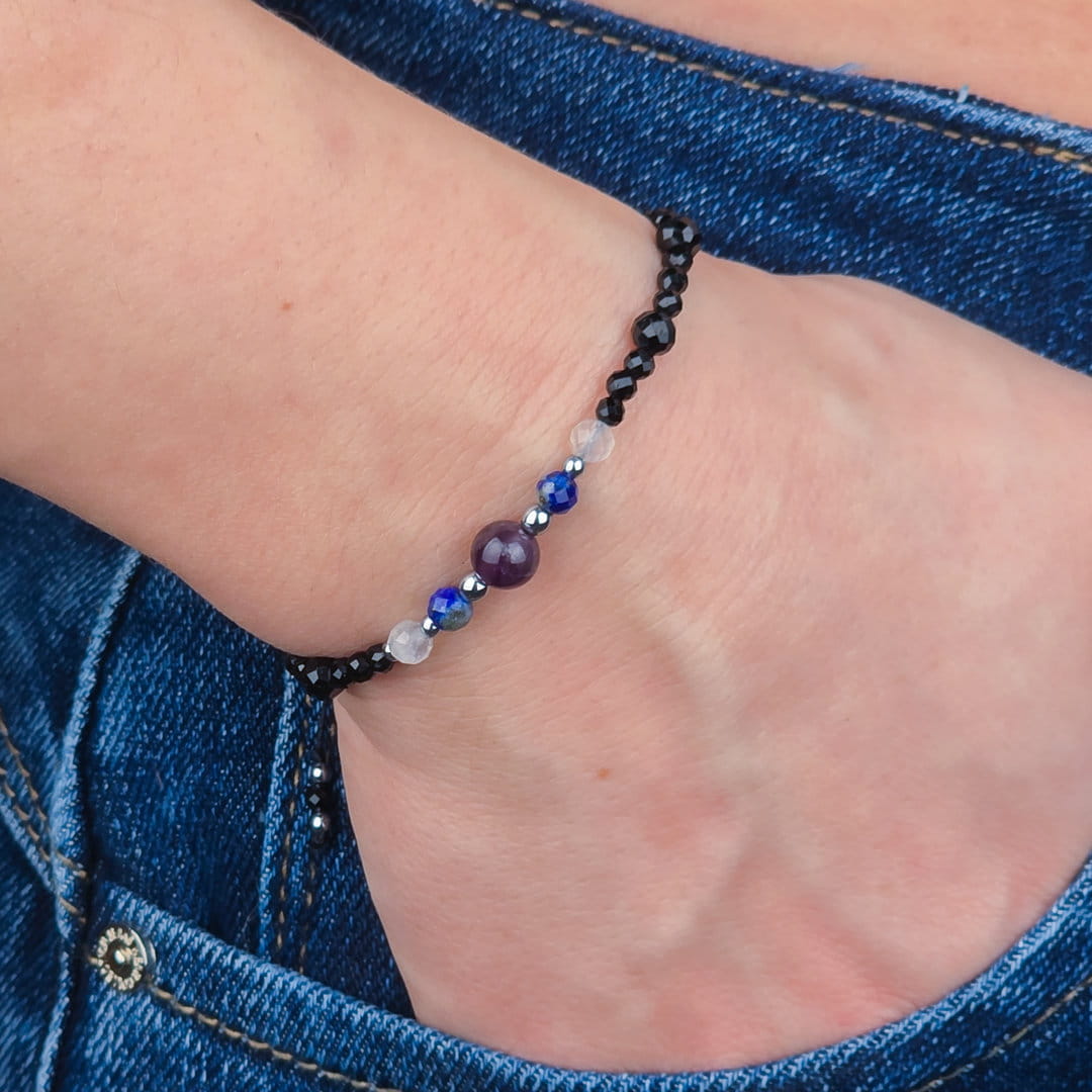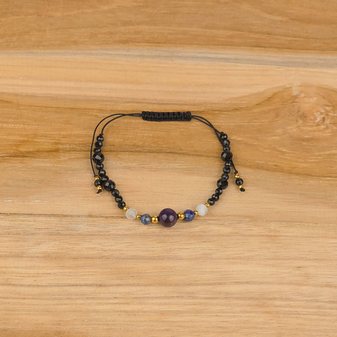 Ta bransoletka dla singielki z ametystu, lapis lazuli, kamienia księżycowego, turmalinu i hematytu została stworzona z myślą o kobietach, które chcą pogłębić kontakt z intuicją, zadbać o wewnętrzny spokój i jednocześnie ochronić swoją energię. To harmonijne połączenie kamieni wspierających świadomość, emocjonalną równowagę i stabilność.
