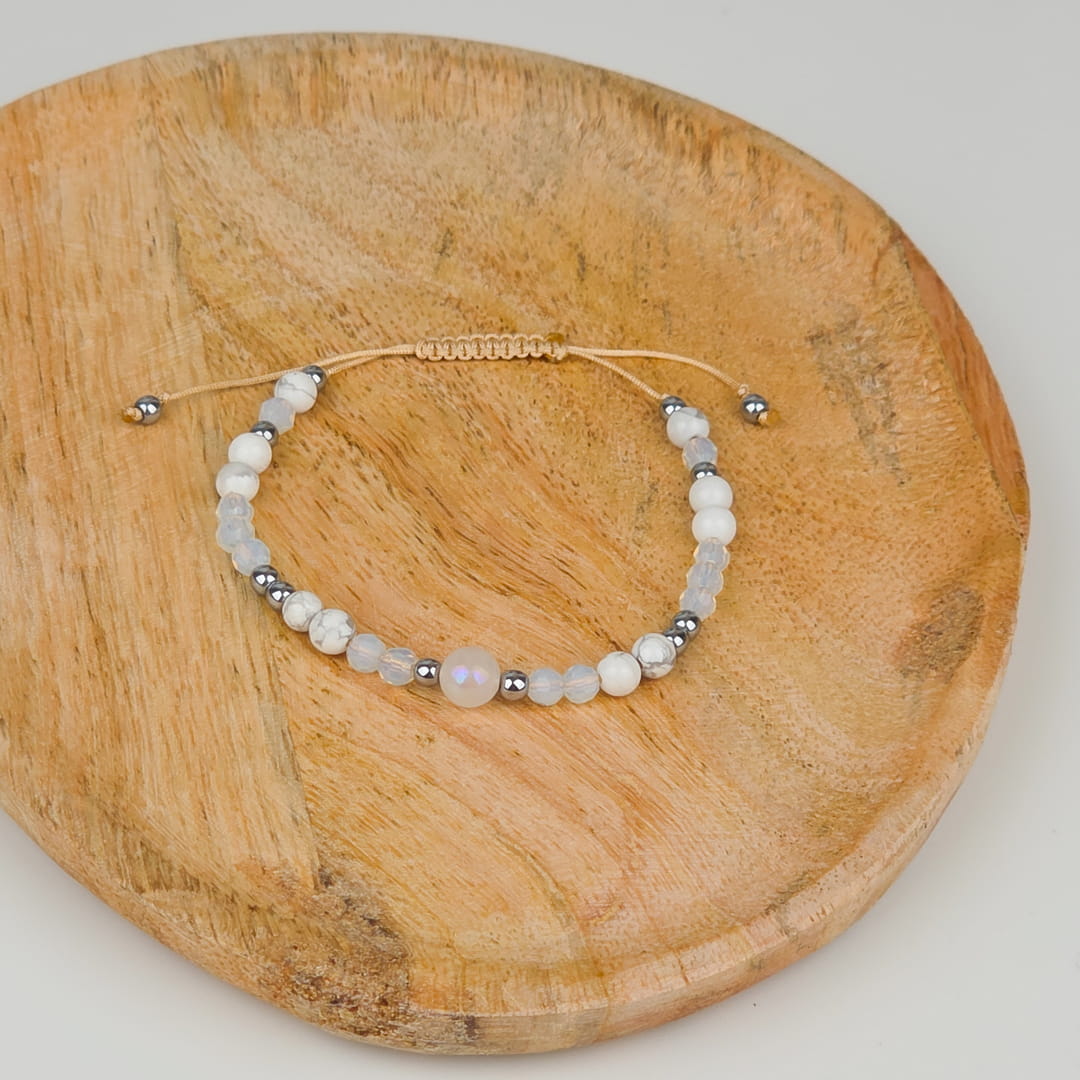 Bransoletka sznurkowa z kamieniem księżycowym, opalitem, howlitem i srebrnym hematytem – „Księżycowa Aura”