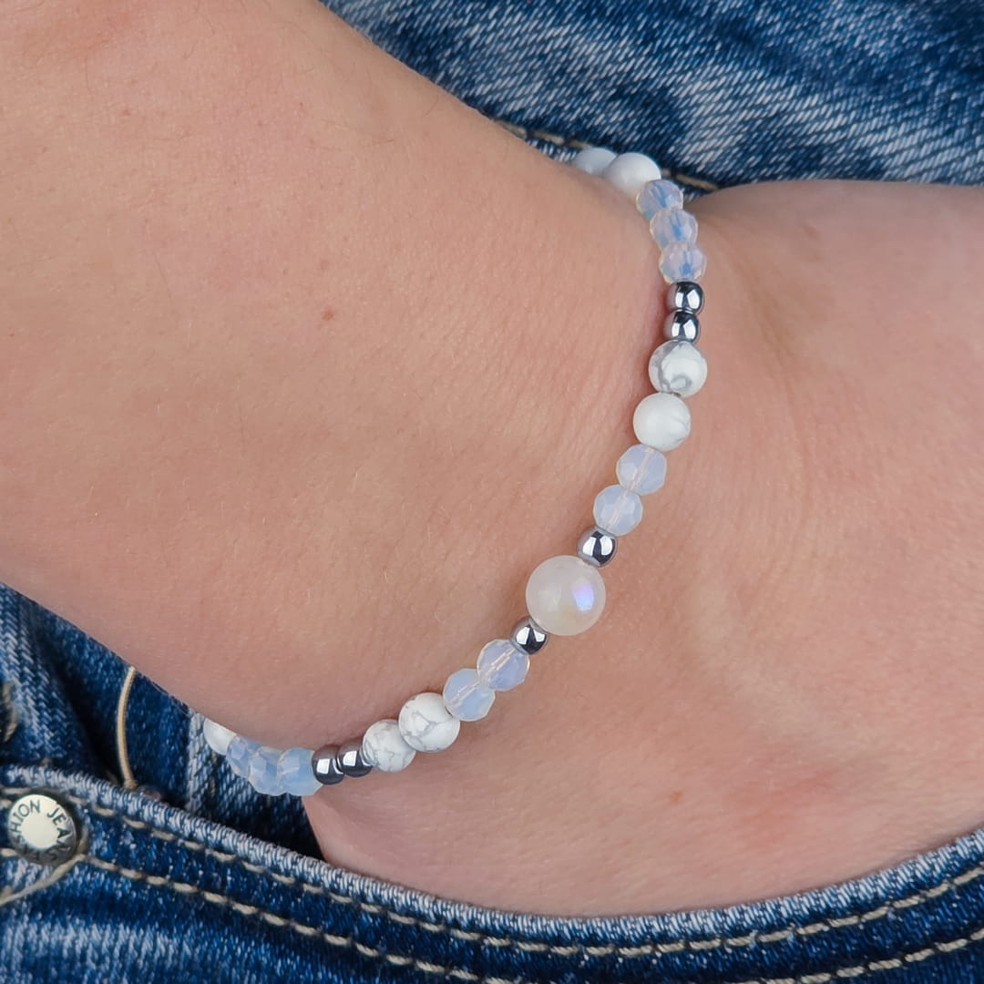 Bransoletka „Księżycowa Aura” - kamień księżycowy, opalit, howlit & srebrny hematyt