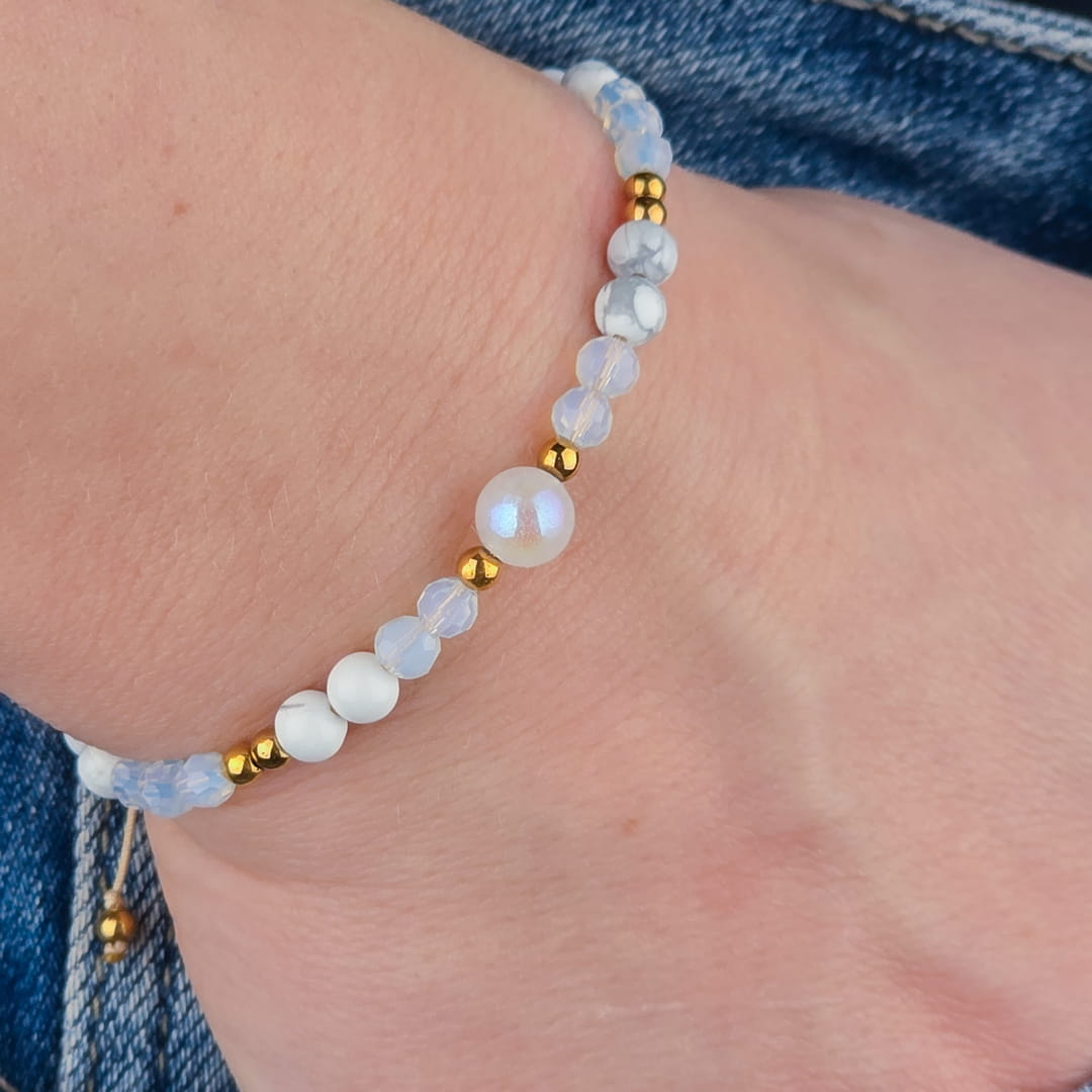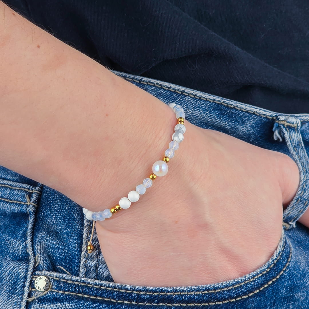 Delikatna i pełna harmonii – niczym blask księżyca odbijający się w wodzie. Kamień księżycowy wspiera intuicję, opalit dodaje lekkości i czystości myśli, howlit wycisza emocje, a złoty hematyt rozświetla aurę subtelną energią słońca.