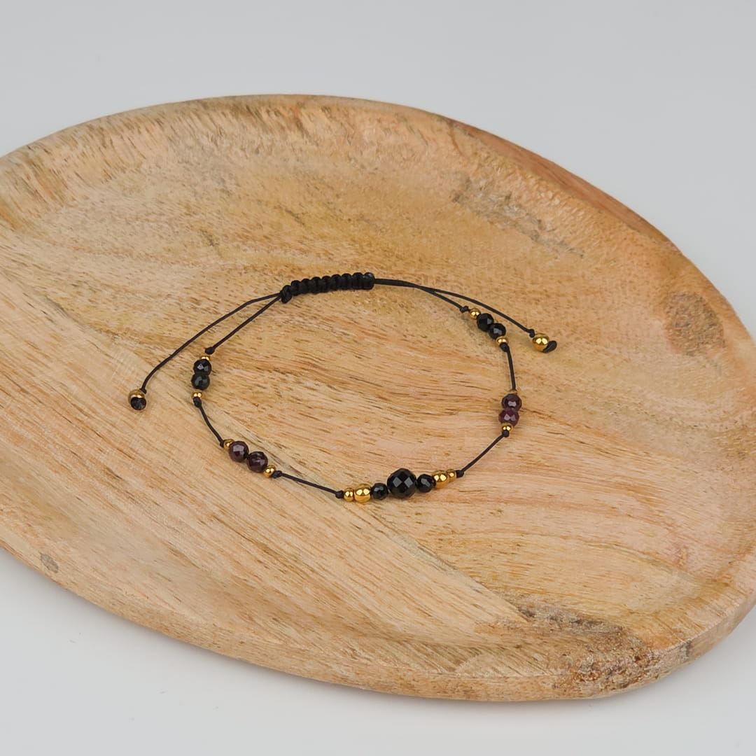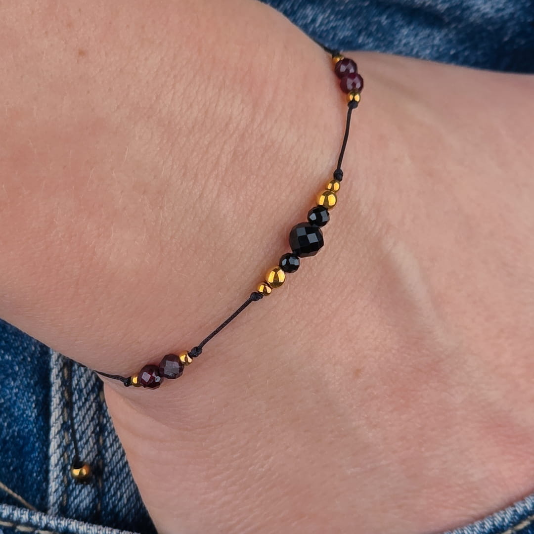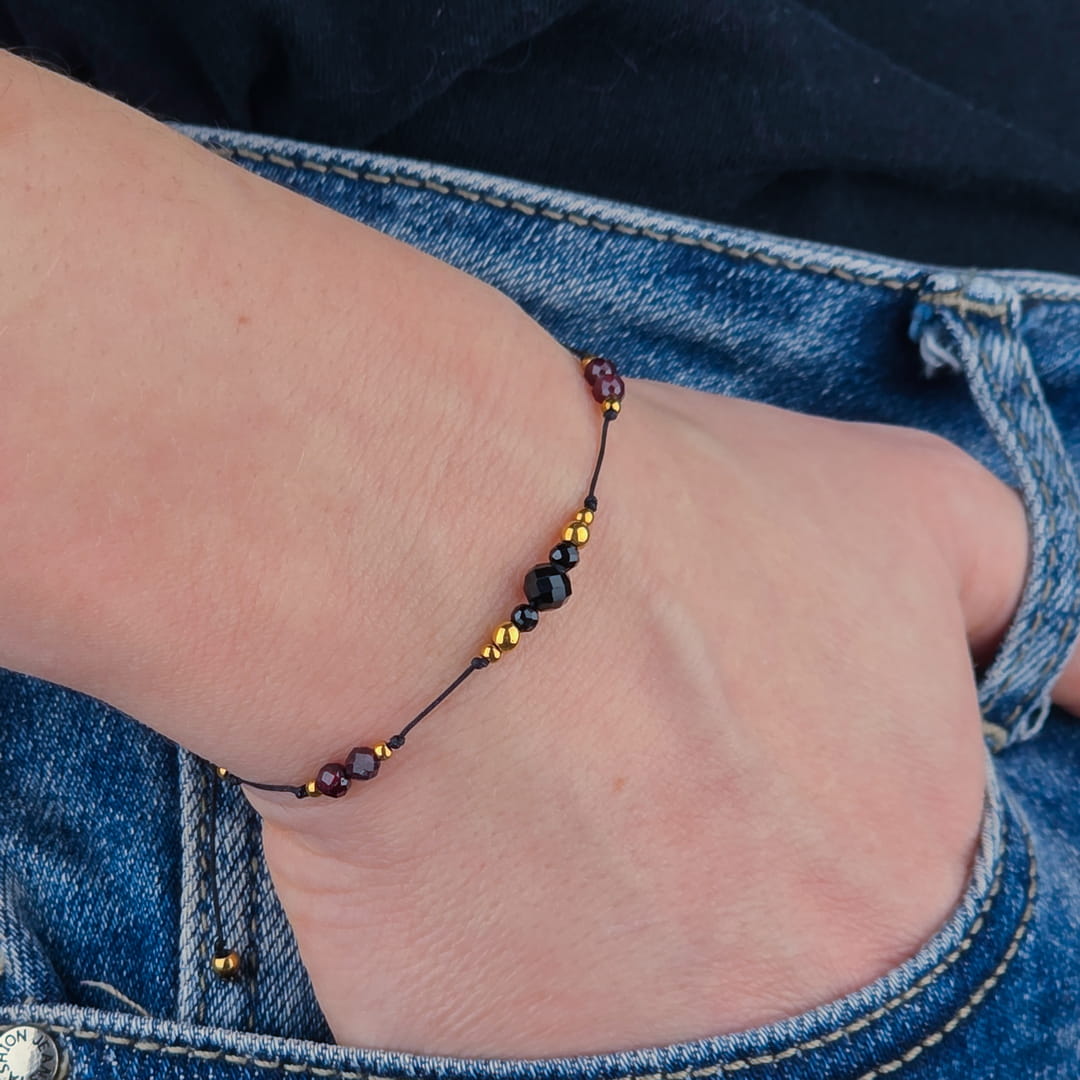 Bransoletka sznurkowa z turmalinu, granatu i złotego hematytu – „Ognista Energia”