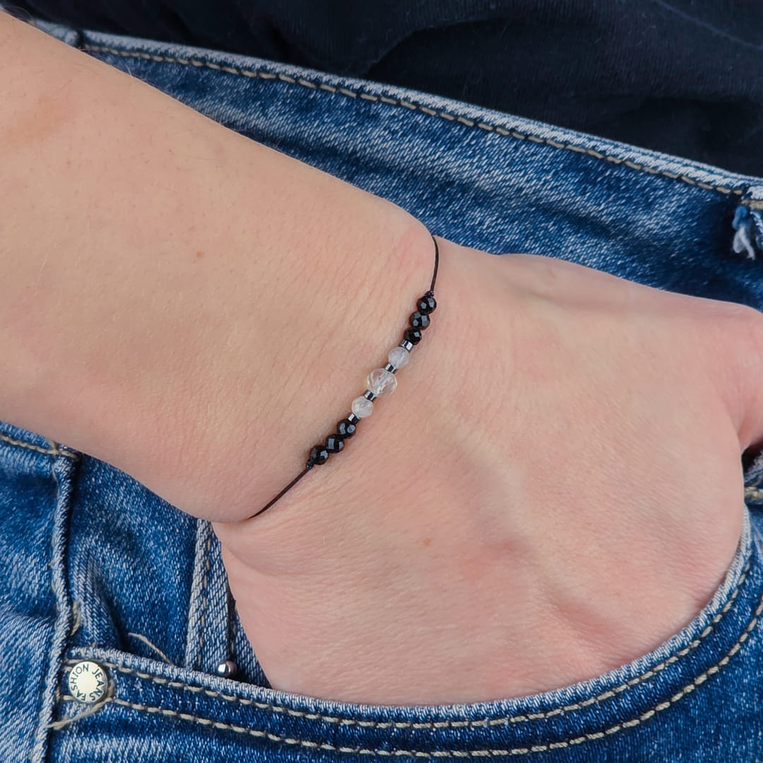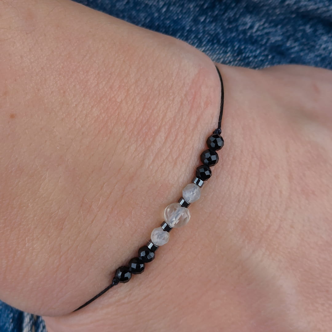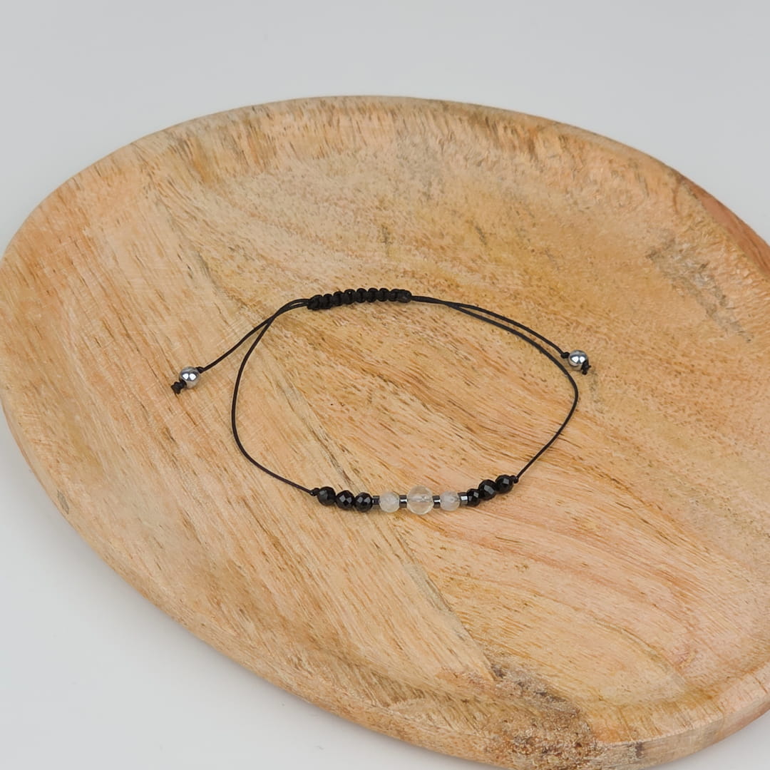 Cytryn rozświetla nastrój i przyciąga obfitość, turmalin chroni i uziemia, a srebrny hematyt dodaje klarowności. Razem tworzą minimalistyczny talizman, który nosisz blisko skóry – lekki, regulowany, gotowy na każdy dzień.