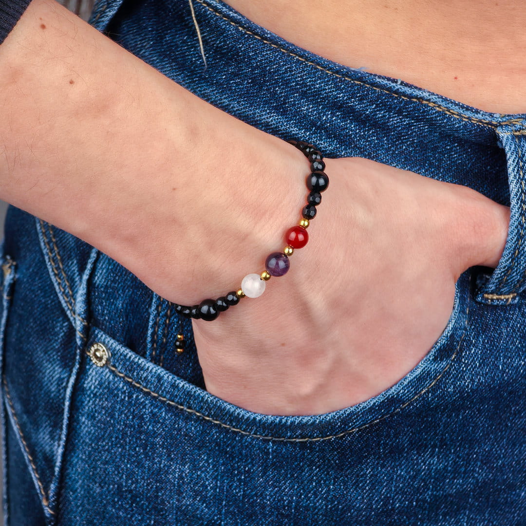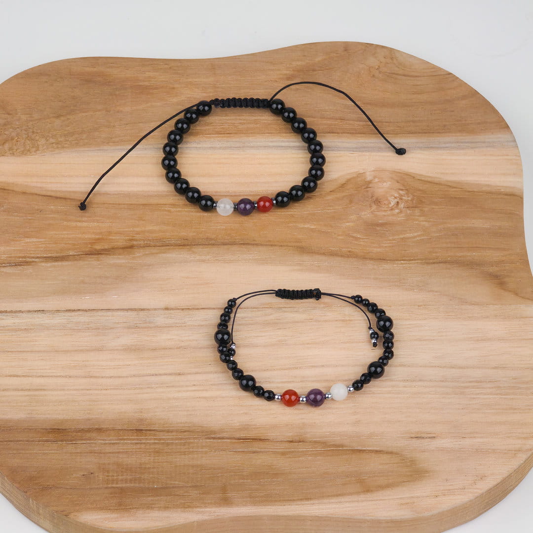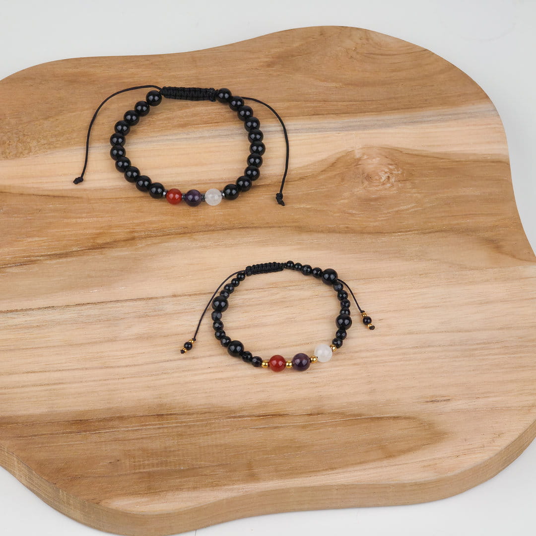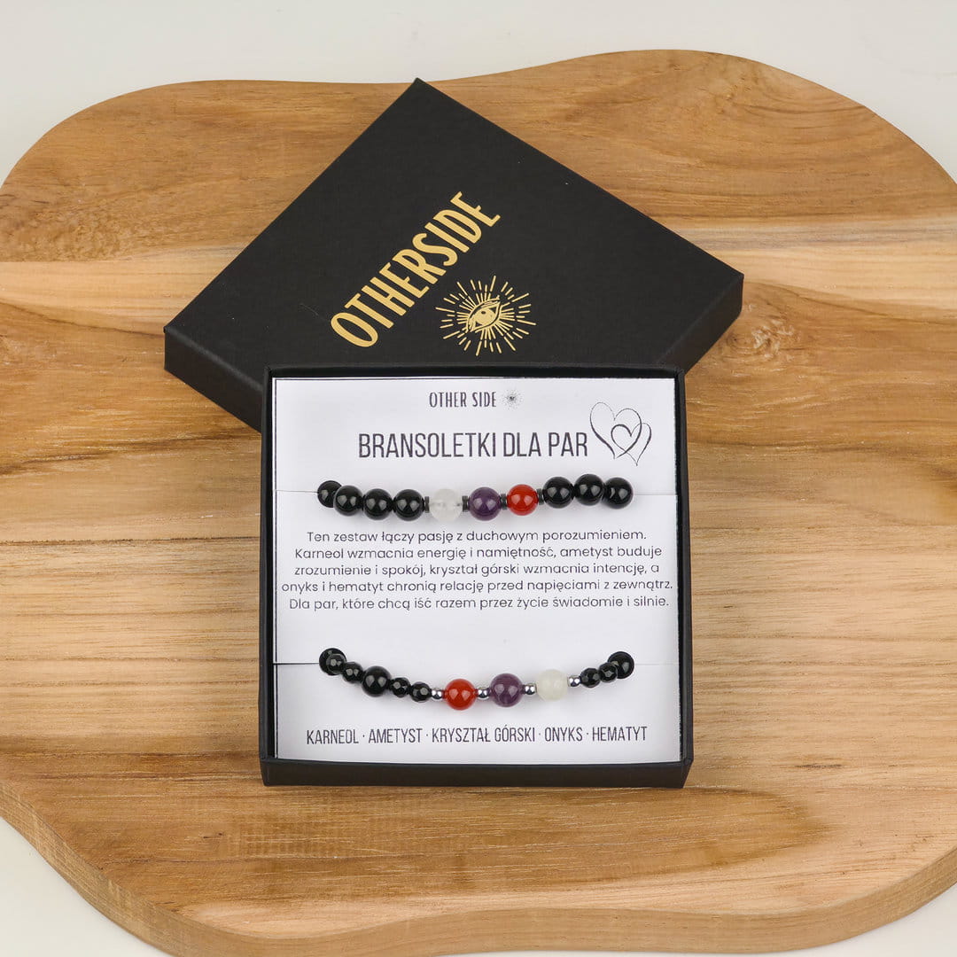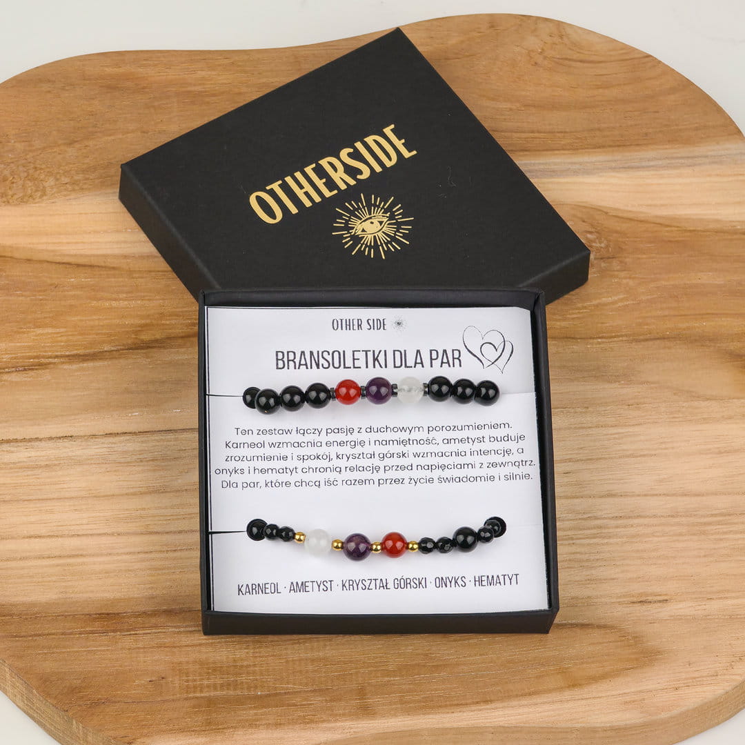 Ten zestaw bransoletek dla par z karneolu, ametystu, kryształu górskiego i onyksu został stworzony jako symbol bliskości, zaufania i wspólnej energii. To biżuteria, która przypomina o więzi — niezależnie od miejsca i czasu.