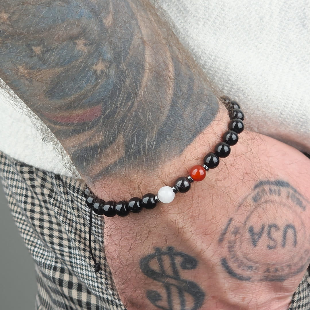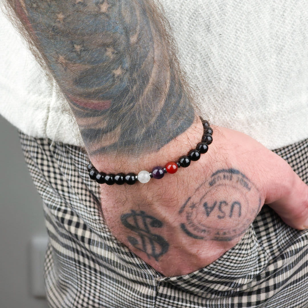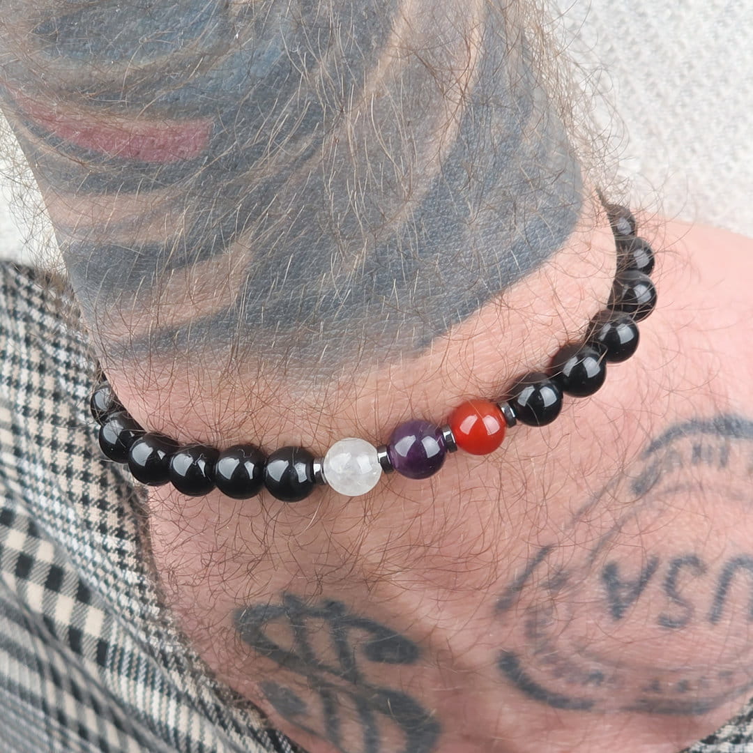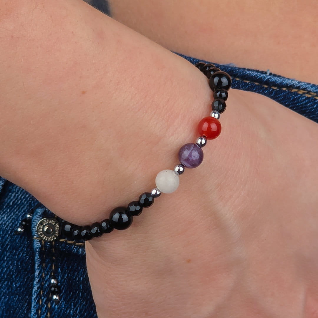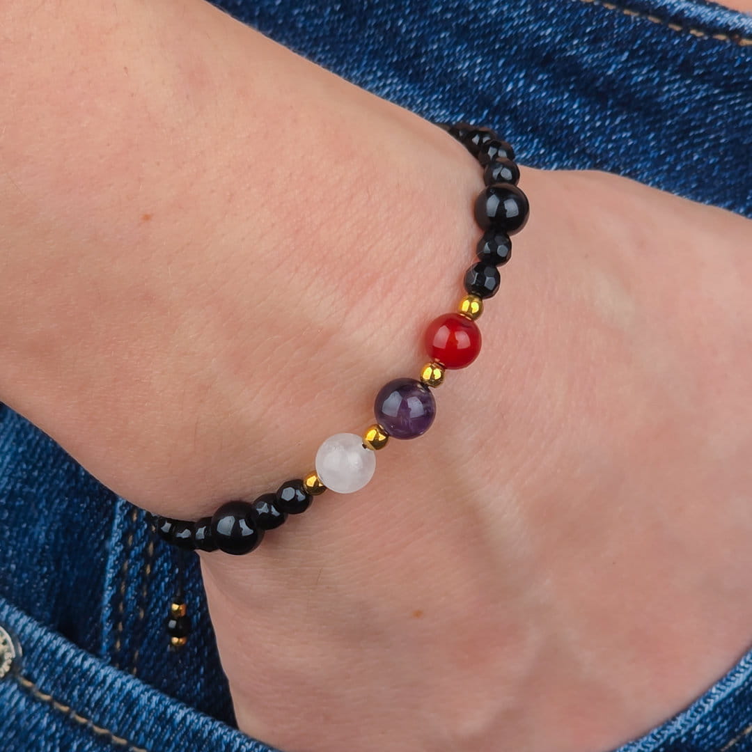 Ten zestaw bransoletek dla par z karneolu, ametystu, kryształu górskiego i onyksu został stworzony jako symbol bliskości, zaufania i wspólnej energii. To biżuteria, która przypomina o więzi — niezależnie od miejsca i czasu.