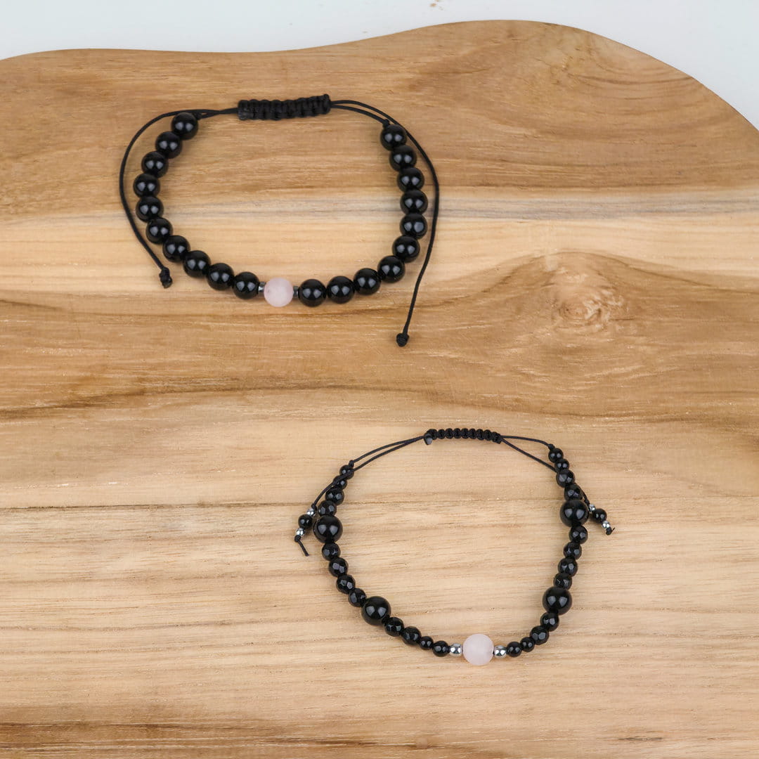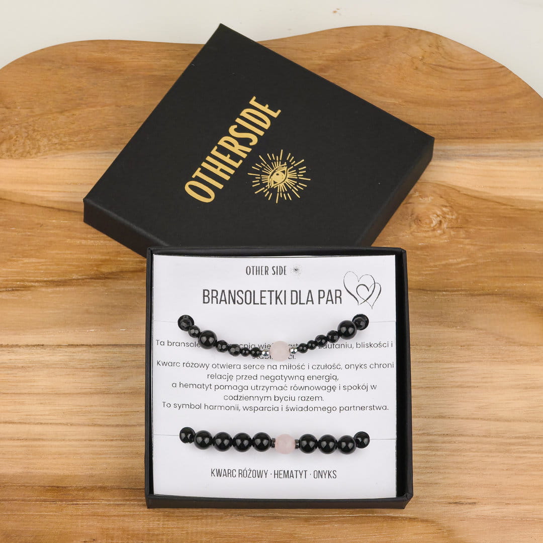 Zestaw bransoletek dla par, który łączy energię miłości (kwarc różowy) z ochroną i stabilnością (onyks i hematyt).