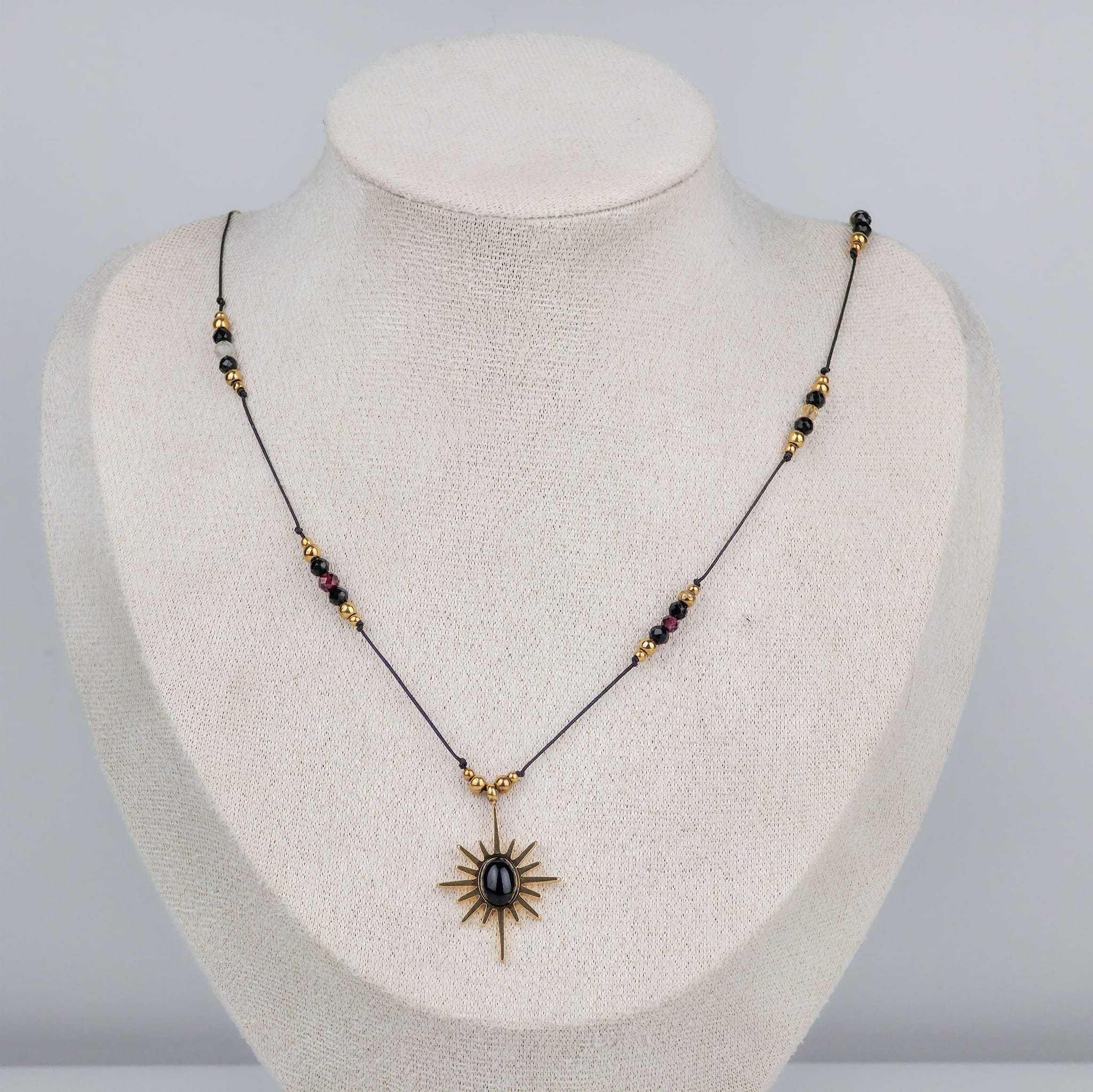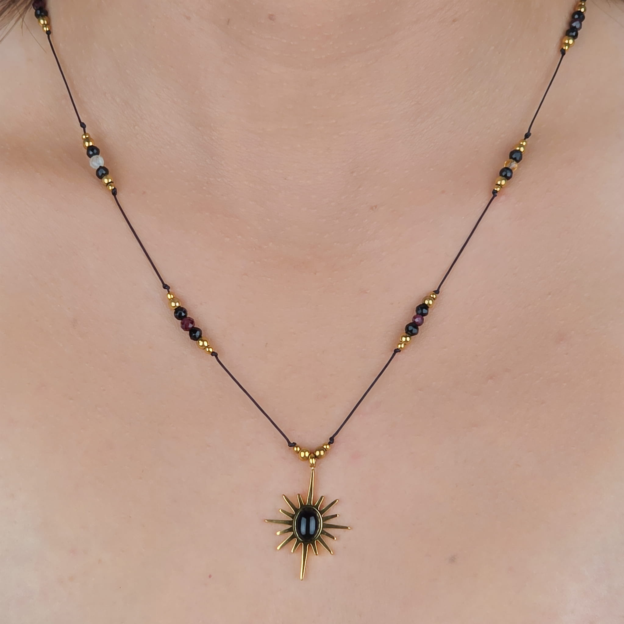 W centrum znajduje się złota zawieszka słońca z onyksem (stal chirurgiczna) – symbol ochrony i skupienia energii w jednym punkcie. Onyks wzmacnia siłę woli i chroni przed chaosem z zewnątrz. Granat pobudza do działania, wzmacnia namiętność i odwagę. Cytryn dodaje lekkości, przyciąga dobrobyt i oczyszcza aurę. Przekładki z hematytu wspierają równowagę i koncentrację.