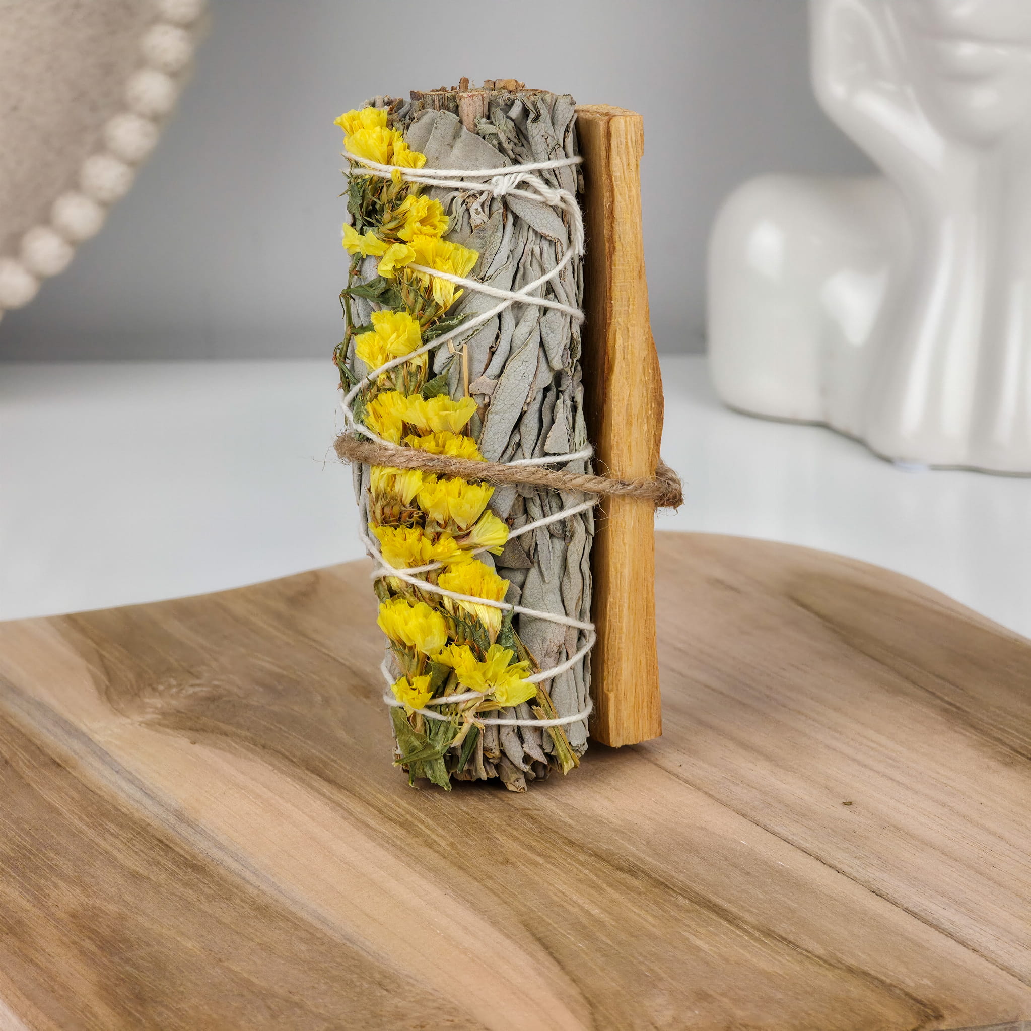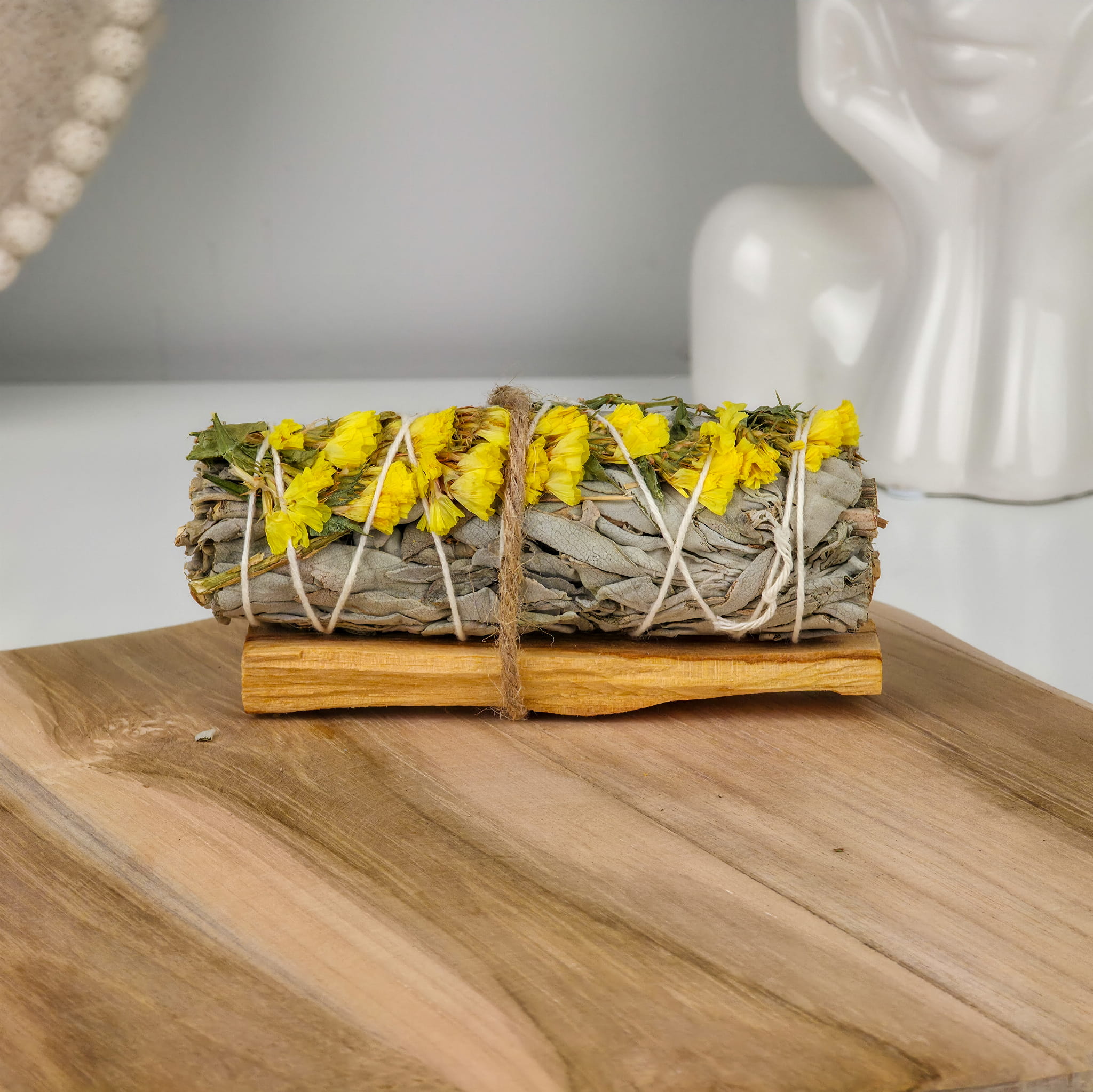 Biała Szałwia od wieków uważana jest za najsilniejsze naturalne kadzidło, używane do oczyszczania przestrzeni i ochrony energetycznej. W tym rytualnym zestawie została wzbogacona o barwne kwiaty Sinuata (zatrwian wyrębny) oraz drewienko Palo Santo, znane jako „Święte Drzewo”. Całość przewiązana jutowym sznurkiem tworzy unikalny, naturalny amulet, który oczyszcza, harmonizuje i ozdabia jednocześnie.