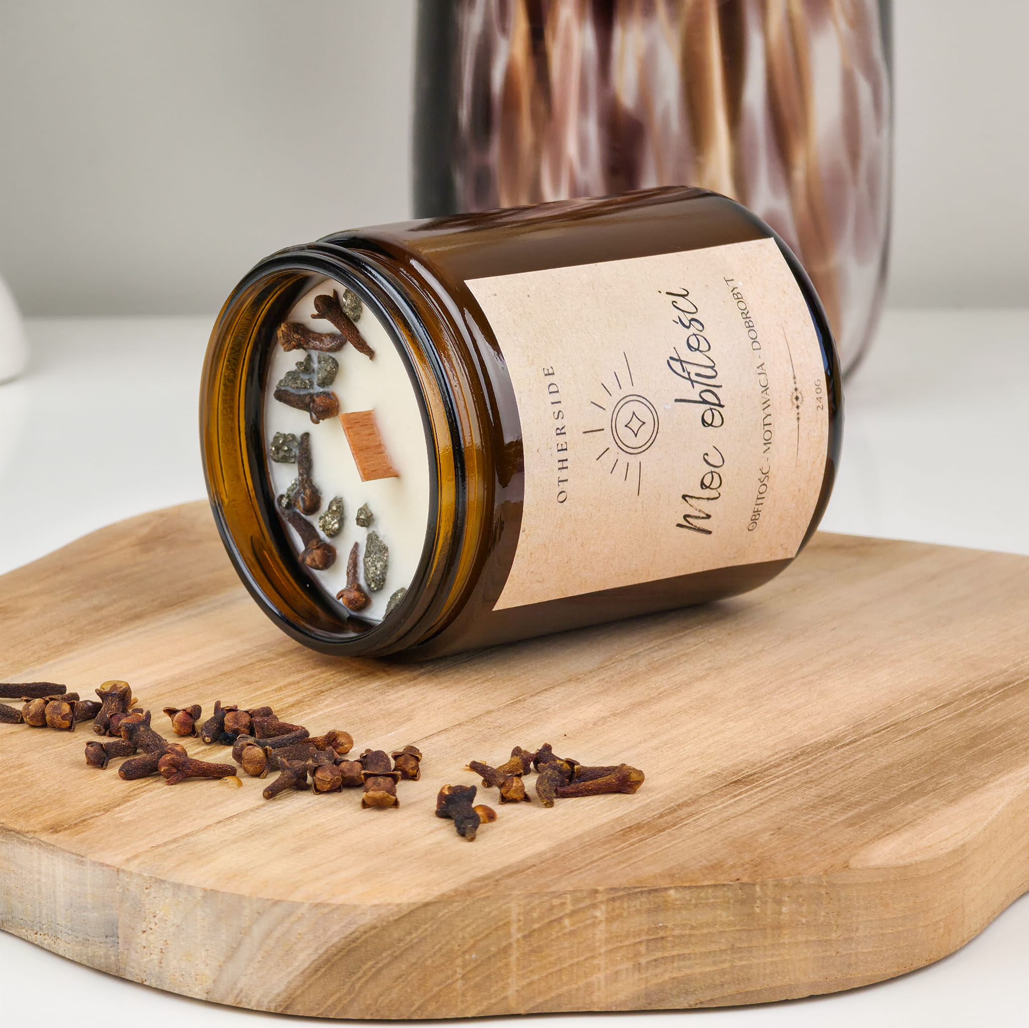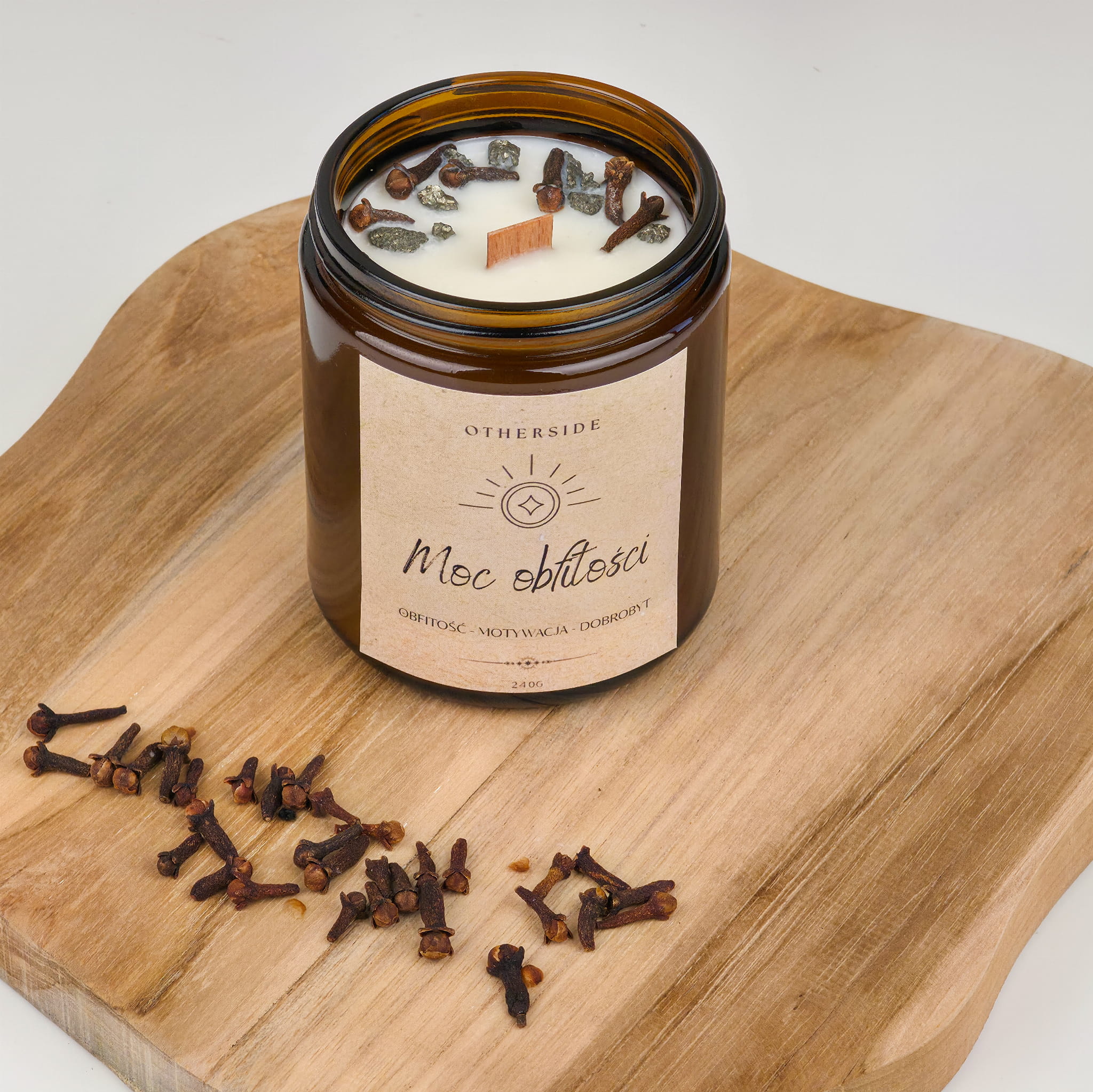 Naturalna Świeca Sojowa Moc Obfitości | Soczyste Drewno + Piryt + Goździk | Bogactwo | 240g