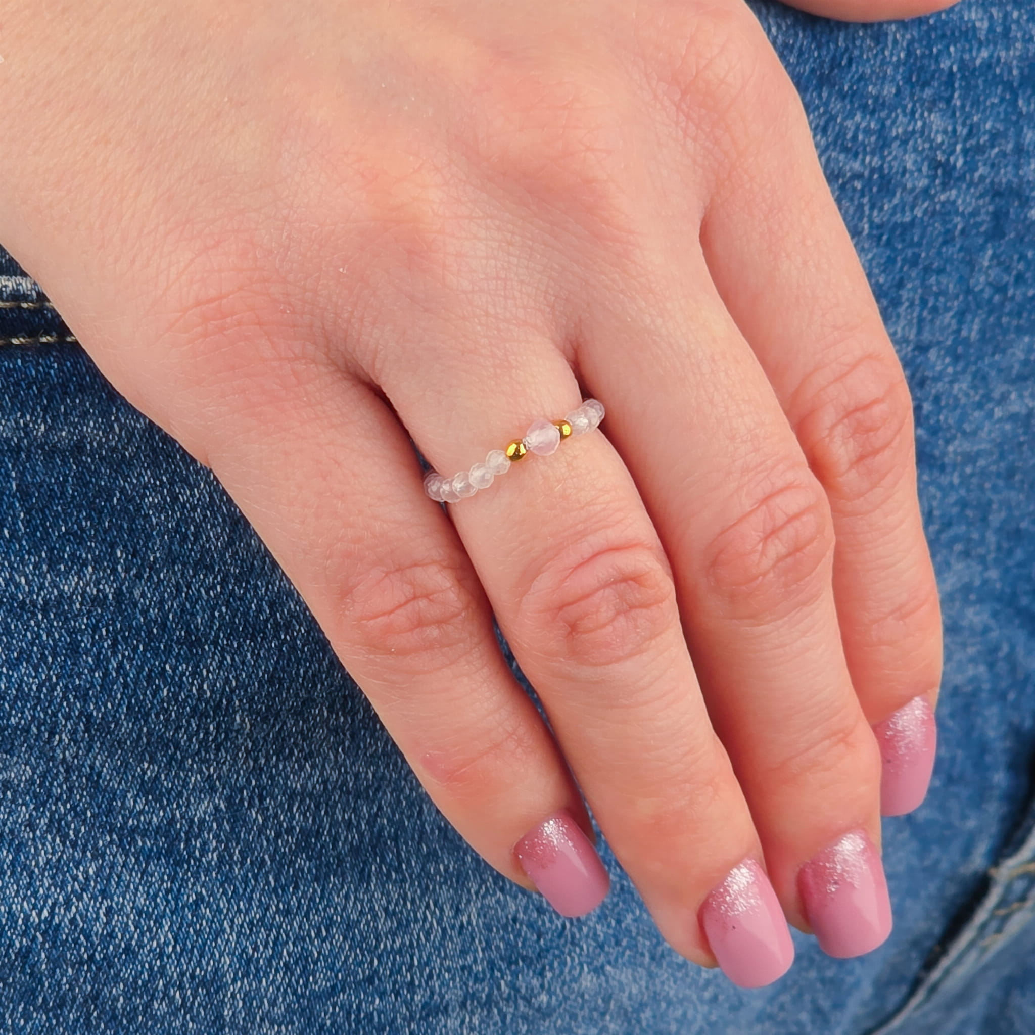 Kwarc różowy od wieków nazywany jest kamieniem miłości – otwiera serce na czułość, bliskość i poczucie bezpieczeństwa. Jego subtelna energia koi emocje i wprowadza delikatną aurę spokoju. W połączeniu z hematytem, który ugruntowuje i dodaje równowagi, pierścionek staje się talizmanem harmonii – wspiera w budowaniu relacji, wzmacnia wewnętrzną siłę i pozwala czuć się dobrze w swojej przestrzeni. To drobna, ale pełna mocy biżuteria, która otula energią serca i subtelnym blaskiem.