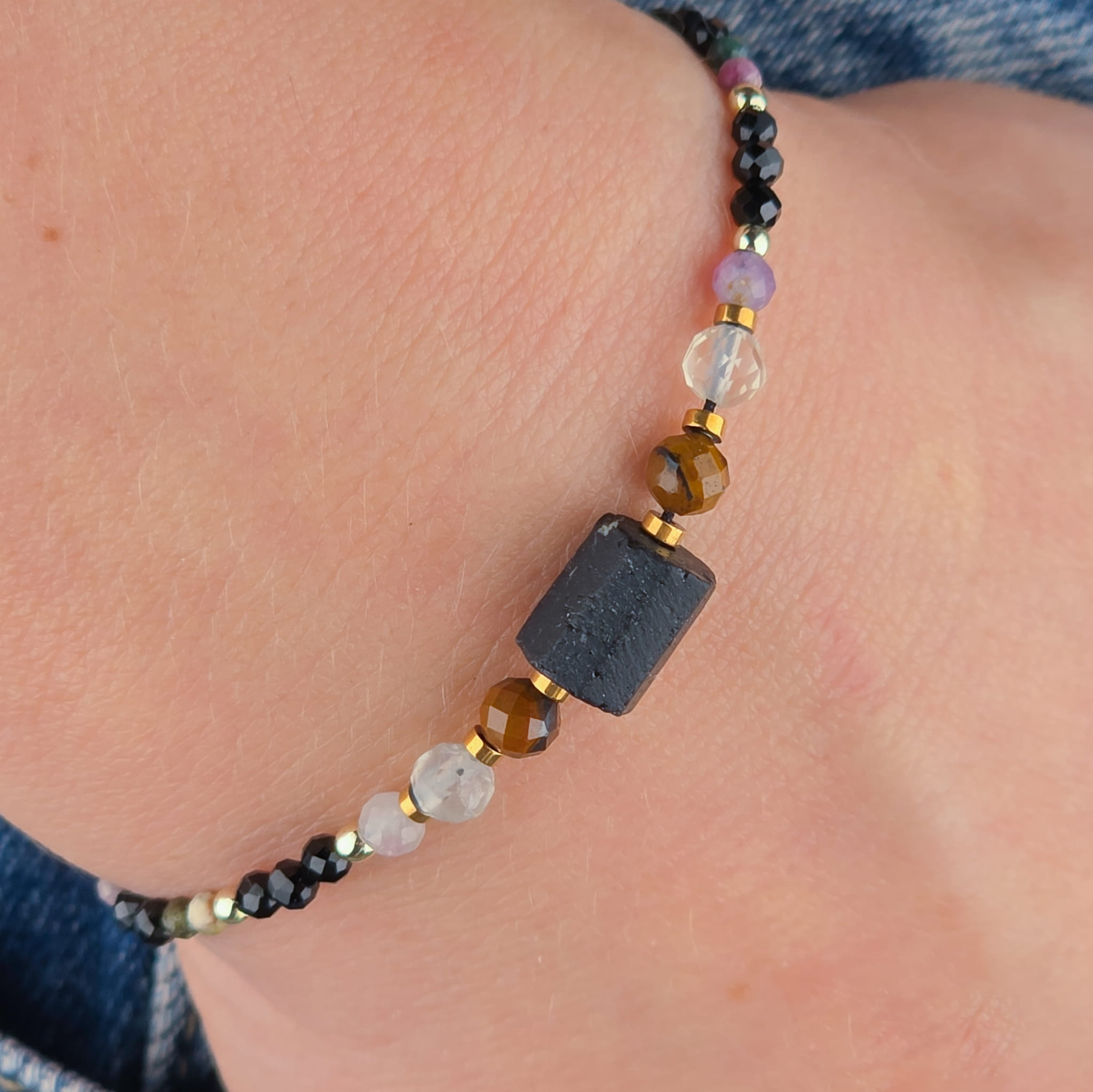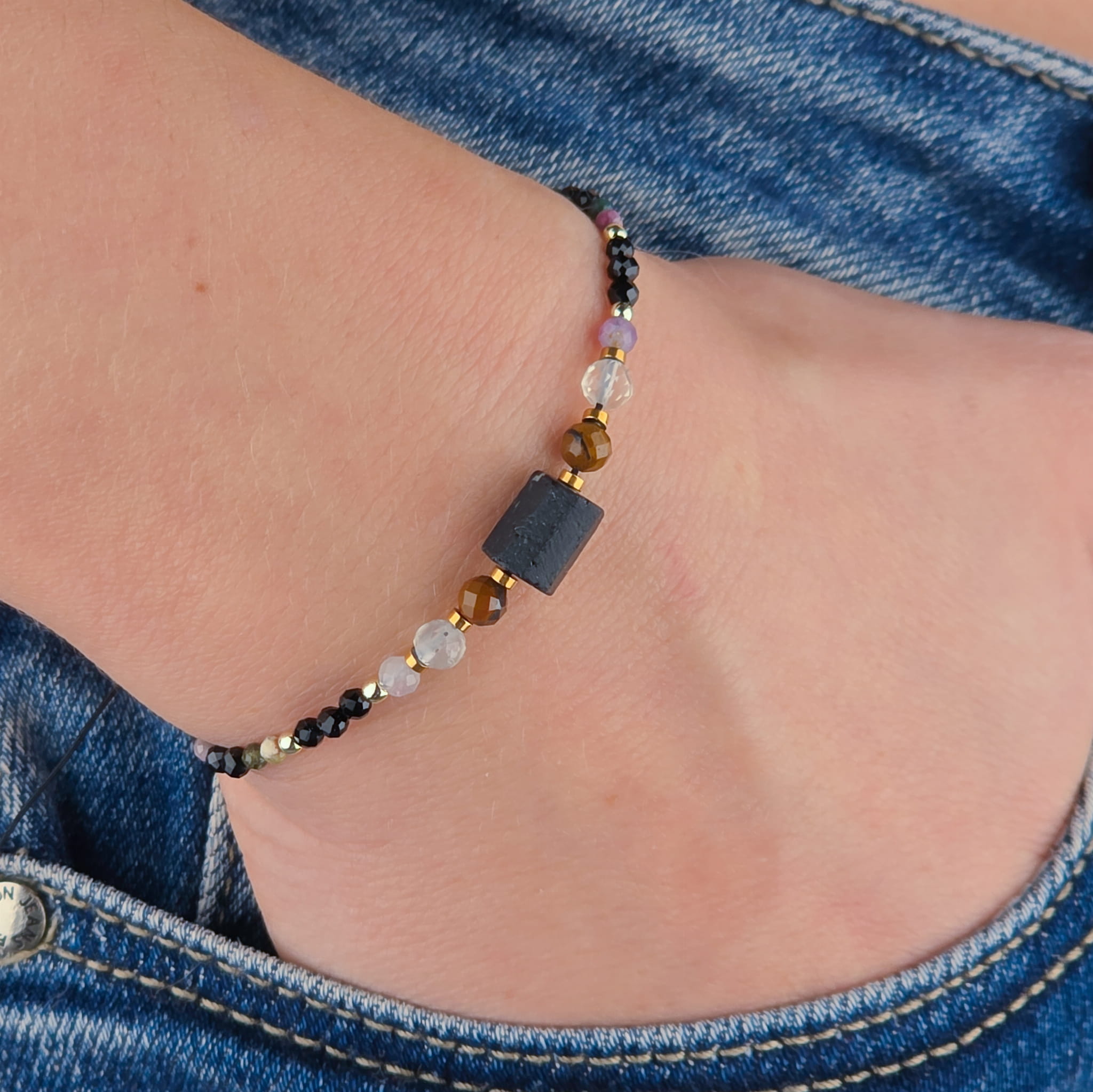 „Tarcza Energetyczna” to bransoletka stworzona dla tych, którzy świadomie budują swoje granice energetyczne. Kamienie zostały dobrane tak, aby tworzyć wyraźne, silne pole ochronne – wokół Ciebie i w Tobie.