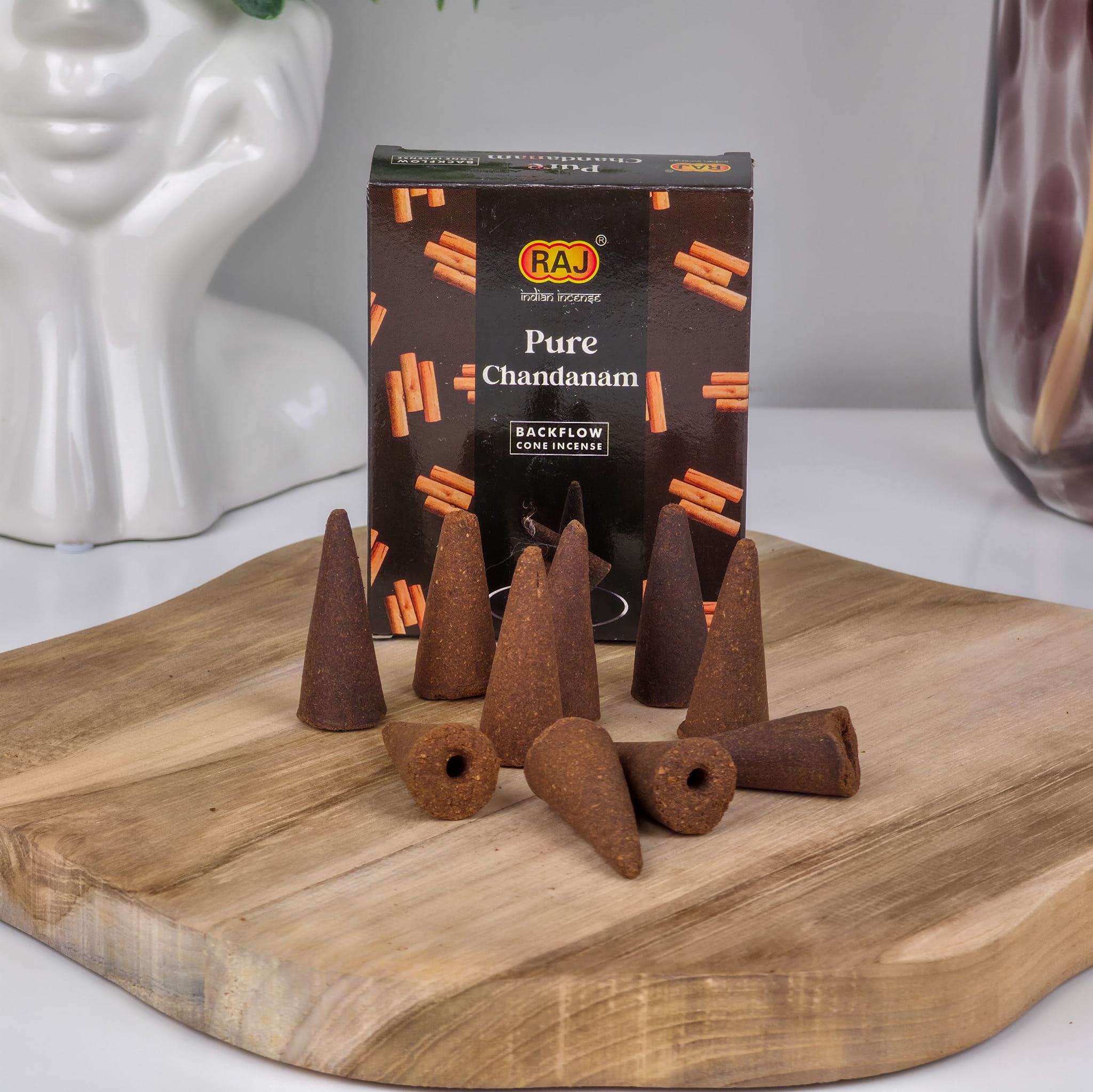 Każdy stożek Raj jest wytwarzany ręcznie w Indiach, z naturalnych składników i olejków eterycznych. Dzięki nowej strukturze masy i dopracowanej recepturze, kadzidełka palą się równomiernie przez około 30 minut, roztaczając intensywny, drzewno-korzenny aromat sandałowca.