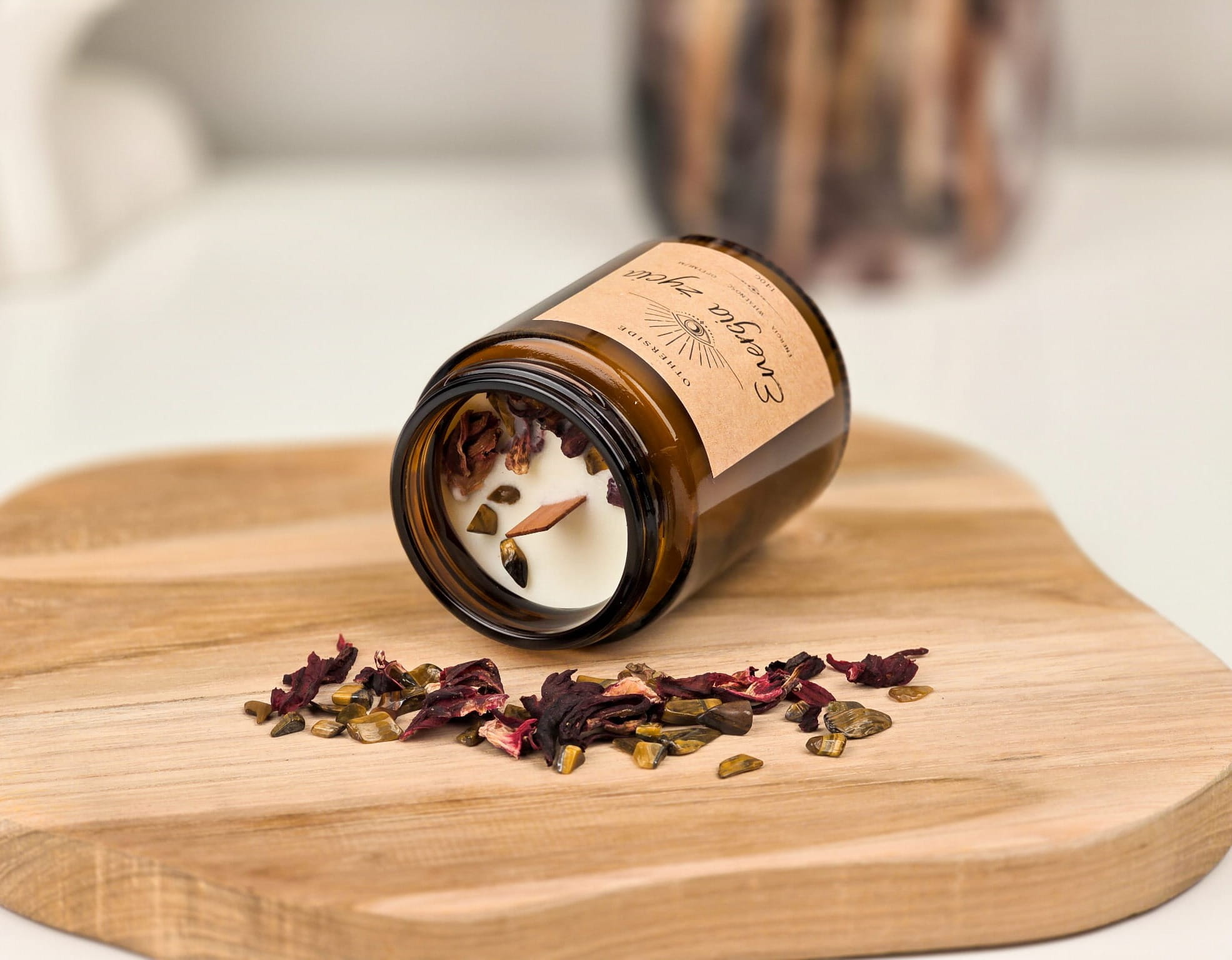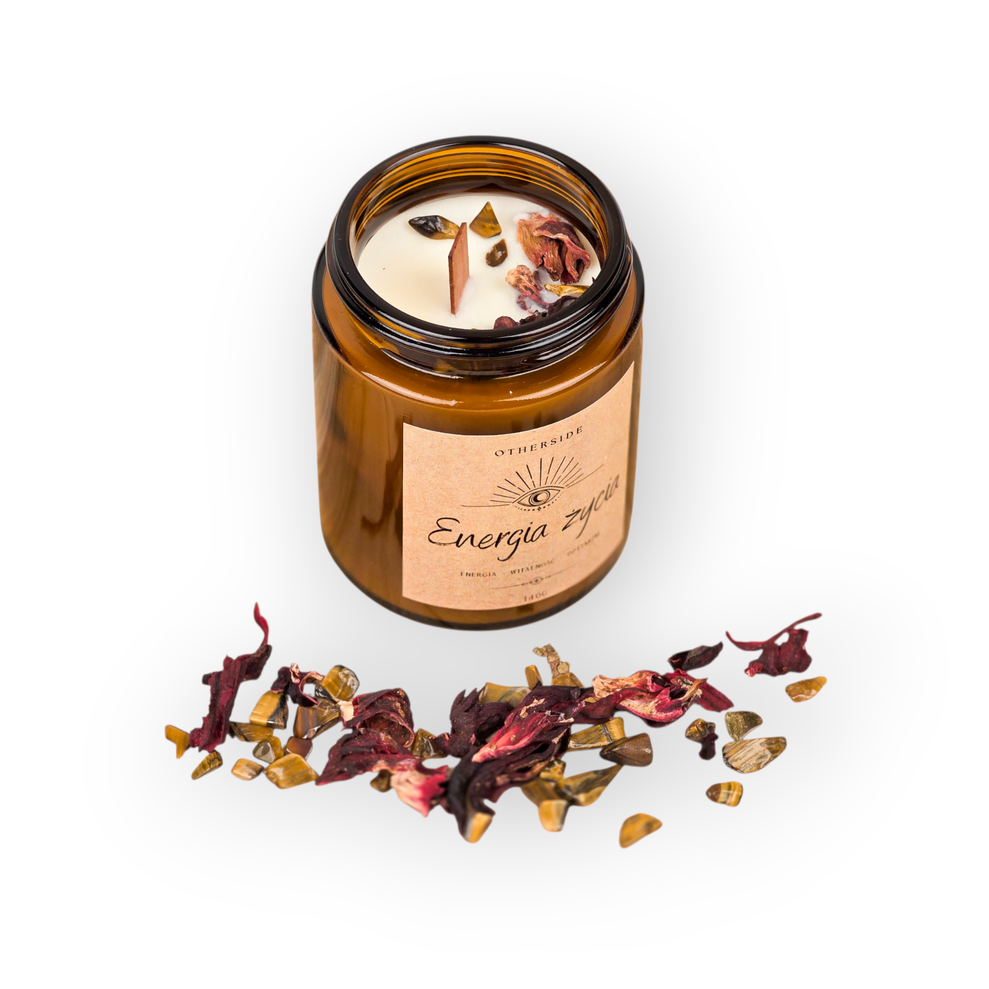 Naturalna Świeca Sojowa Energia Życia | Świeża Bawełna + Tygrysie Oko + Hibiskus | Witalność | 140g