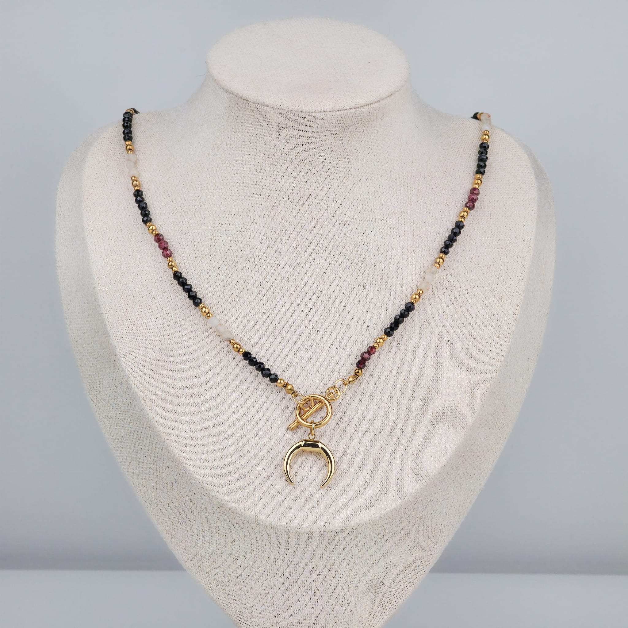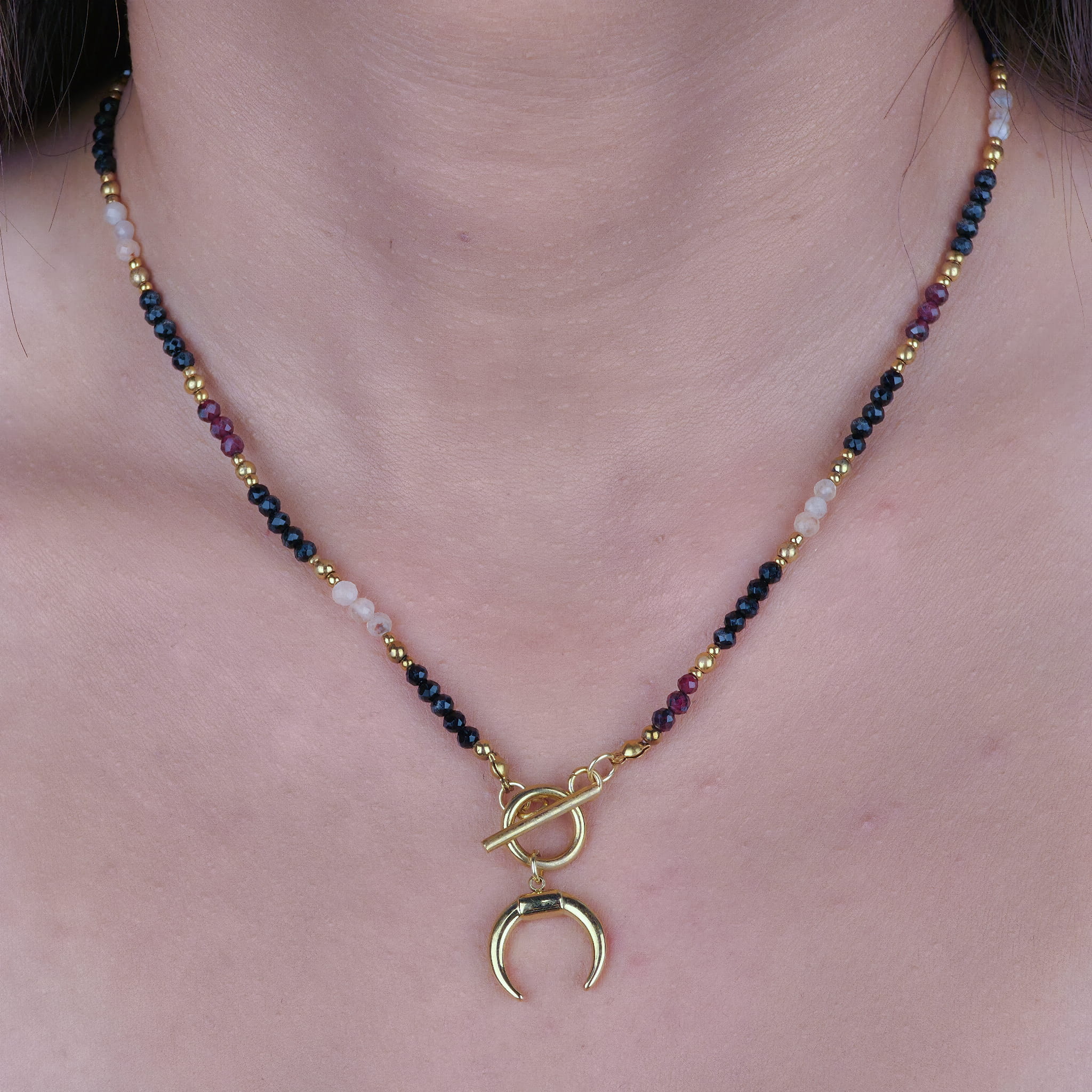 Ten naszyjnik to nie tylko biżuteria. To talizman mocy z kamieniami, które działają – razem i osobno. Onyks otula ochroną i stabilizuje emocje. Granat dodaje odwagi, przywraca pasję i pomaga ruszyć z miejsca. Cytryn? To kamień manifestacji, który przyciąga obfitość i dobre wibracje. Całość dopełniają złote przekładki z hematytu – minerału uziemienia i wewnętrznej harmonii.