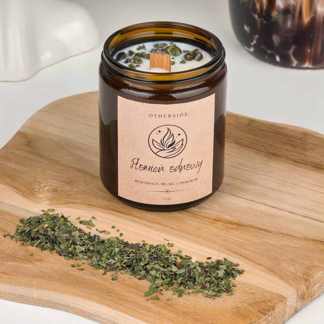 Naturalna Świeca Sojowa Płomień Odnowy | Lawenda + Epidot + Melisa | Regeneracja | 240g