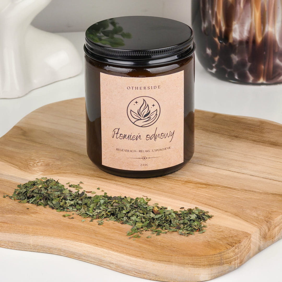 „Płomień Odnowy” to naturalna świeca sojowa zapachowa, stworzona do momentów, gdy czujesz zmęczenie, przeciążenie lub potrzebę zatrzymania. Jej płomień pomaga zwolnić, uspokoić myśli i rozpocząć proces regeneracji – bez presji, bez pośpiechu.