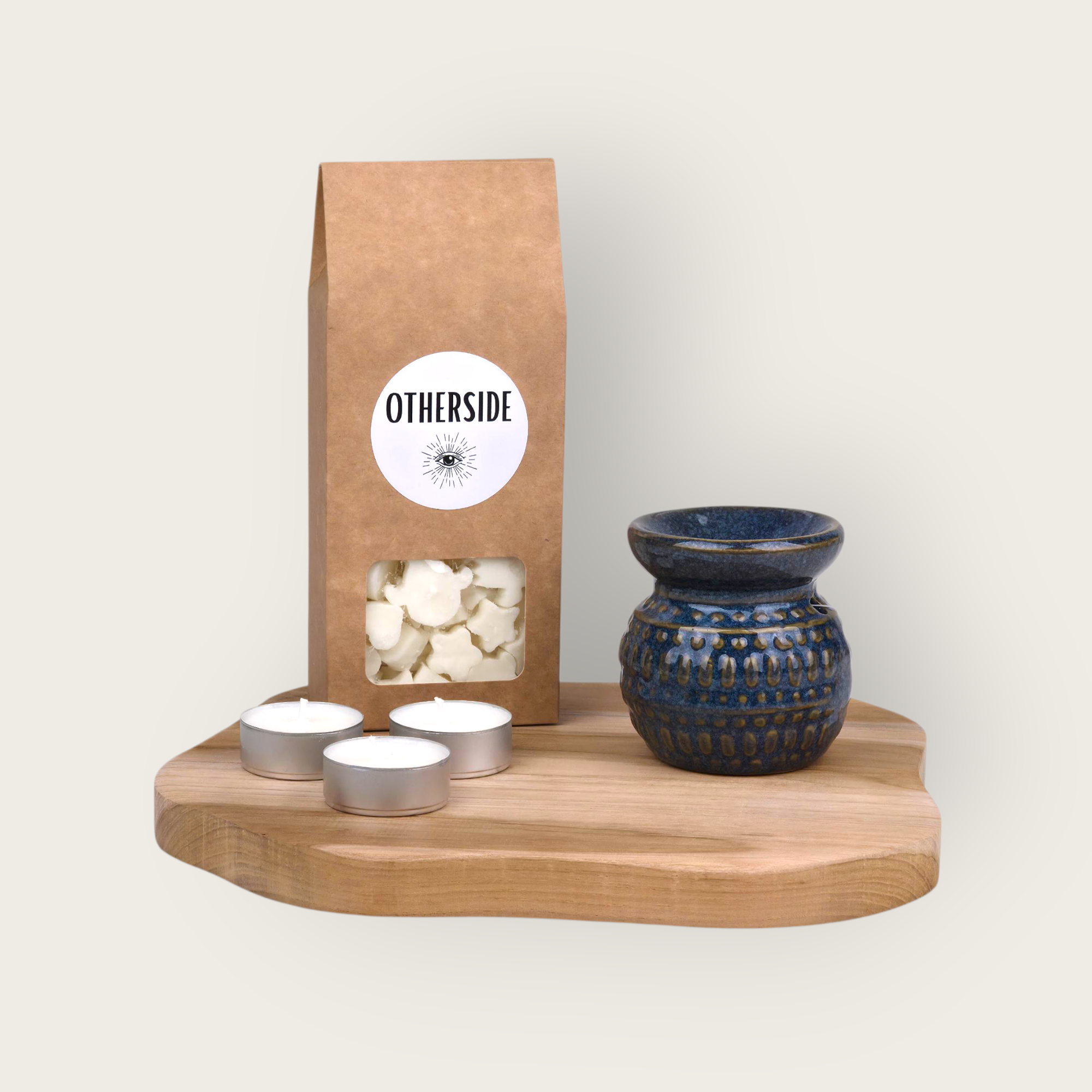 Głęboki granat symbolizuje tajemnicę i wyciszenie. „Nocne Kropelki Edenu” to zestaw, który doskonale sprawdzi się podczas wieczornego rytuału – zapalony tealight i unoszący się zapach wosku tworzą atmosferę spokoju i magii.