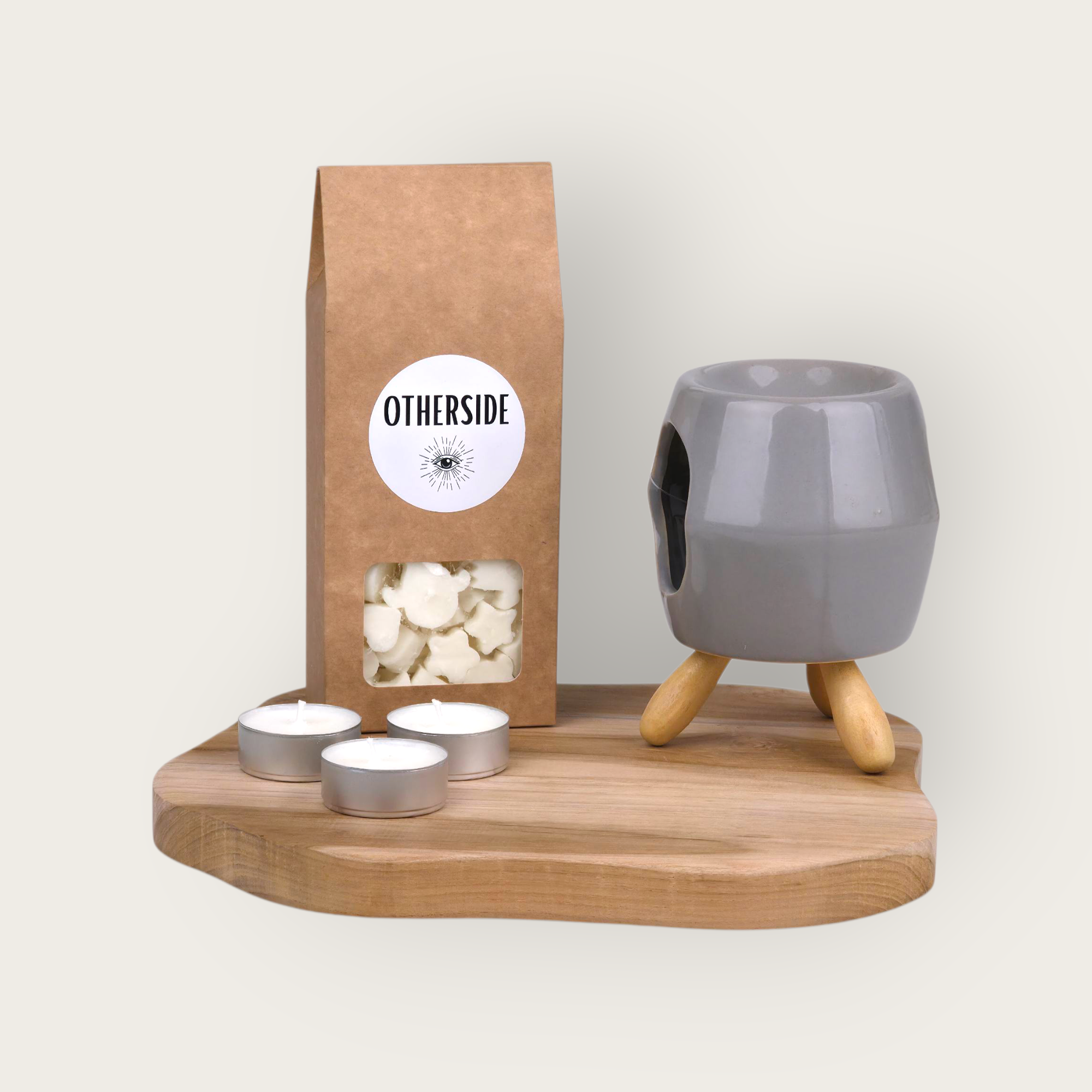 „Przejście Światła” to wyjątkowy zestaw, który łączy w sobie mistykę kształtu i elegancję prostoty. Okrągła forma kominka przypomina portal, przez który przenika światło i energia, a płomień tealightu rozświetla wnętrze ciepłem i spokojem. Szara ceramika z naturalnymi, drewnianymi nóżkami nadaje mu charakter nowoczesnej dekoracji, a zarazem narzędzia rytuału. To więcej niż kominek – to brama do chwili relaksu, odprężenia i harmonii.